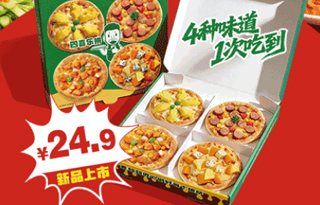 「四喜乐拼」一次乐享“新奥尔良烤鸡肉披萨、缤纷水果披萨、榴莲多多披萨、意式肉酱香肠披萨”四种口味。